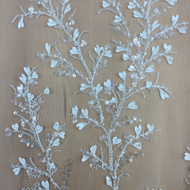Embroidered lace with beads and 3d leaflets.